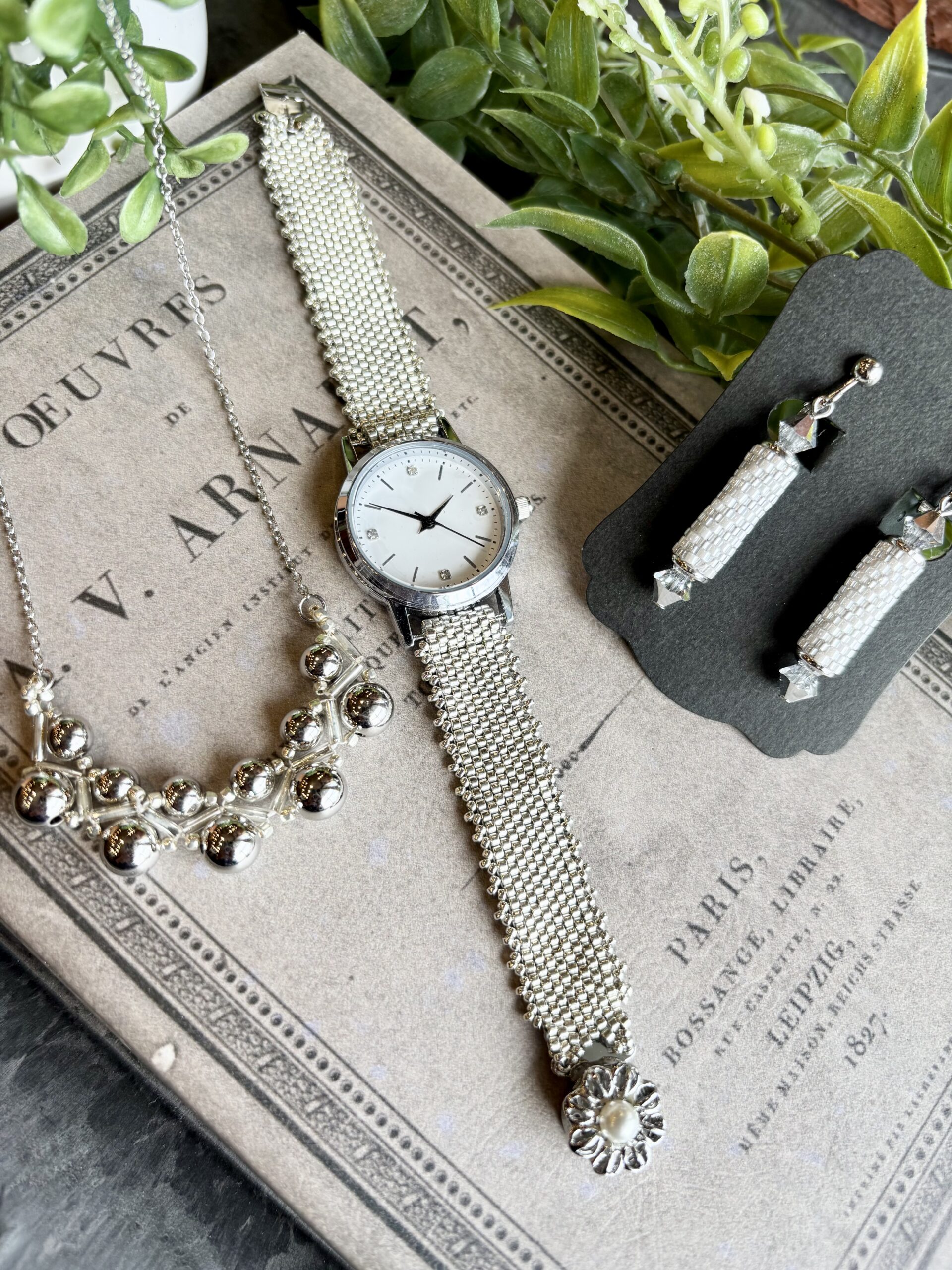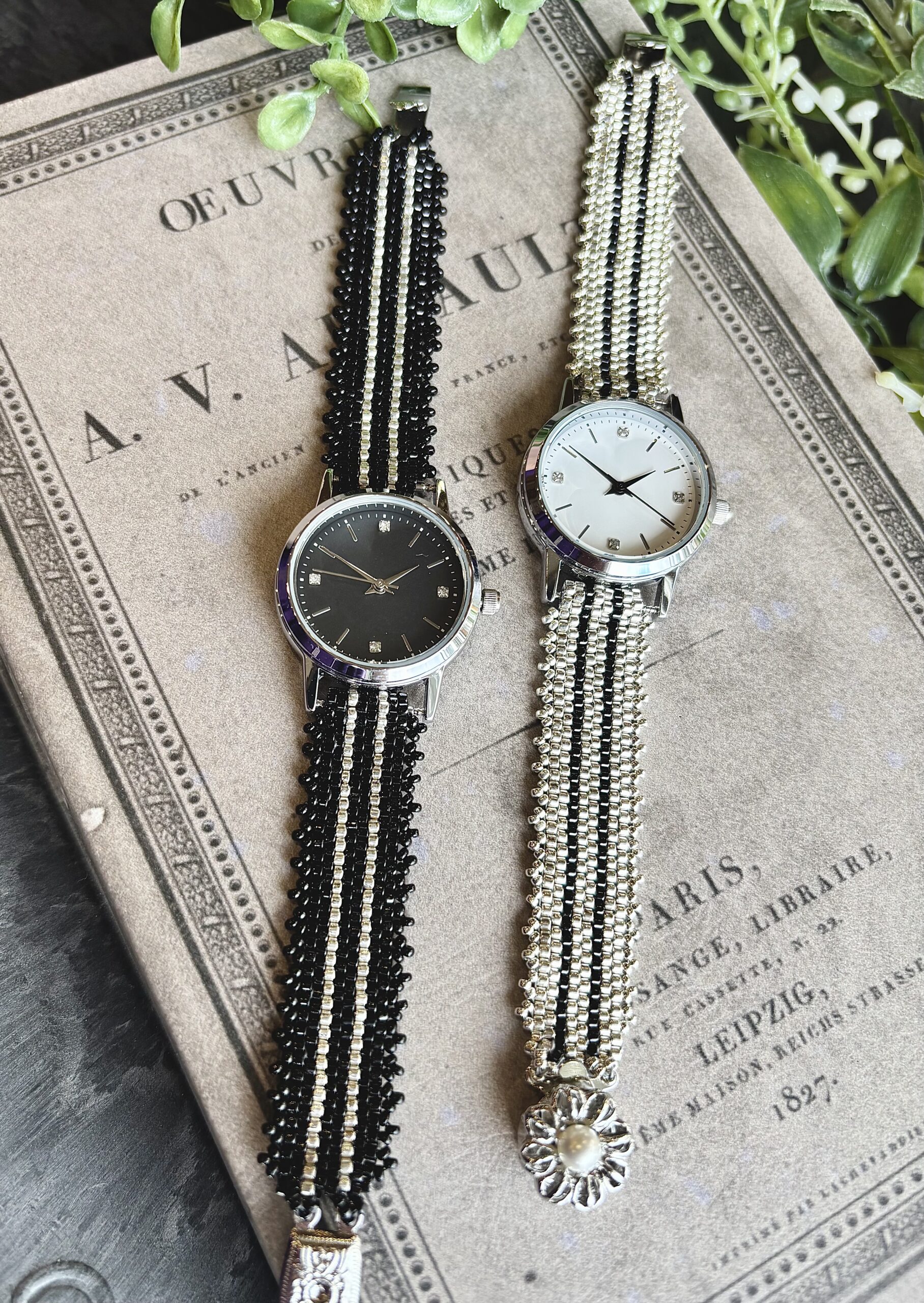 ビーズやソウタシエコードを使用した個性的なイヤリング(ピアス)と新作🌟のビーズの腕時計を販売します♪ シンプルだけどキラキラしてカッコイイ!「これビーズなの?」とオシャレ感満載です♪